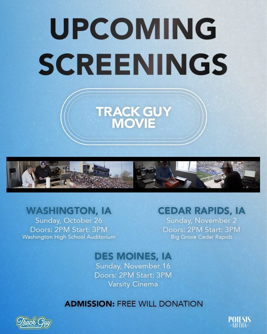 The Track Guy Movie premiered in Fall of 2025 at the Englert Theater in Iowa City.